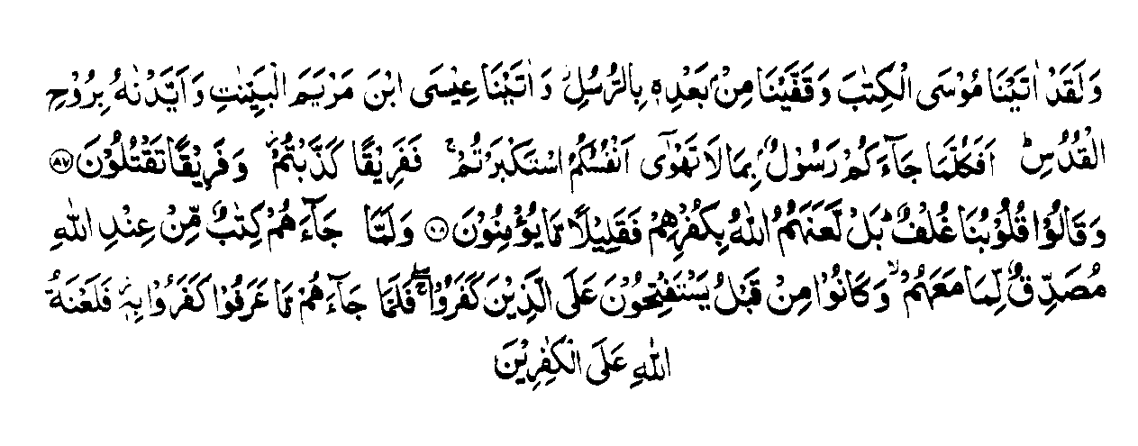 "Verily, We revealed to Moses the scripture and called after him messengers to follow in his footsteps. To Jesus, Son of Mary, We gave manifest signs and We strengthened him with the spirit of holiness. `Will you then, O Jews, every time a prophet comes to you with what you yourselves do not like take to false pride and arrogantly belie some and kill others?' They rationalize and seek to excuse themselves by admitting to dimness of vision. God, however, curses them for their disbelief. Little are they convinced of the truth! And when the book which came from God and which confirmed their own scripture was brought to them and invoked for their benefit they denied it. Hitherto they were boasting of such revelation and deriding the unbelievers for never receiving any. Now that the same truth which they had known beforehand has come to the believers from God they reject it. God's wrath will surely fall upon the unbelievers.”[Qur'an, 2:87-89]