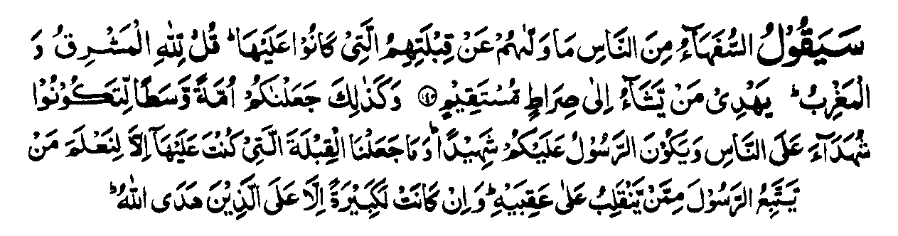 "Some foolish people will ask, `What caused them to change their old orientation?' Say: `To God belongs the East as well as the West. He guides unto His straight path whomsoever he wills." Thus We have caused you to be a nation following the course of the golden mean, witnessing unto mankind and witnessed to by the Prophet. The whole question of the orientation in prayer was intended by us to sift the true believers from the apostates and deceptors. To change orientation is a big travail only to those who have missed the divine guidance."[Qur'an, 2:142-143] |